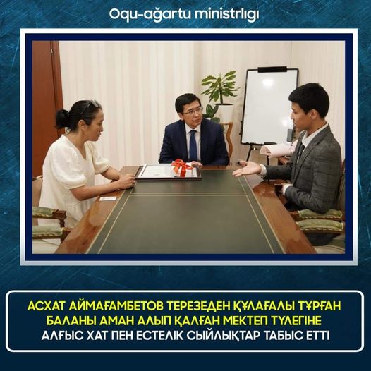 Оқу-ағарту министрі Асхат Аймағамбетов көпқабатты үйдің терезесінен құлап кеткелі тұрған баланы аман алып қалған елордалық мектеп түлегі Есдәулет Дәуітбековпен кездесті. Сондай-ақ кездесуге 17 жастағы батырдың анасы Әсемгүл Қабдықалықова да қатысты.
