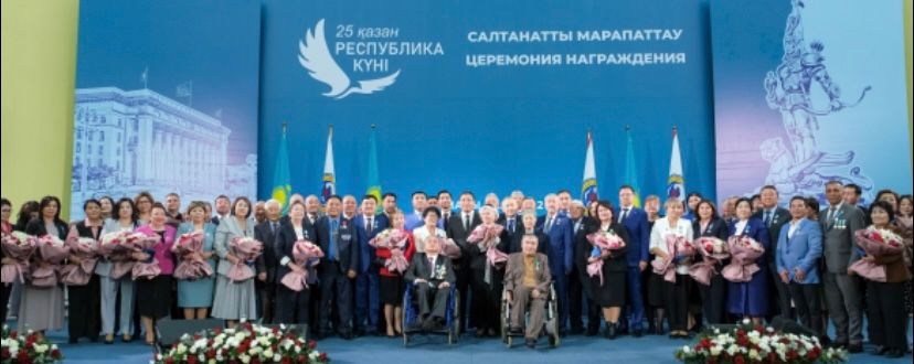Атап өтерлік жайт, мерекелік күндер күнтізбесіне 13 жылдан кейін оралған Республика күні қарсаңында мемлекеттік наградаларды тапсырудың салтанатты рәсімі осыдан 32 жыл бұрын Қазақ КСР Мемлекеттік Егемендігі туралы Декларация қабылданған залда өтті.
