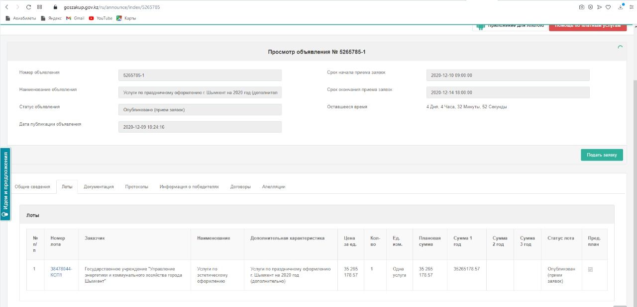 Қызметтің атауына қатысты бағанда «Шымкент қаласын 2020 жылға арналған эстетикалық және мерекелік безендіру бойынша қызметтер» деп көрсетілген. Лоттың жалпы құны – 35 265 178 теңге.